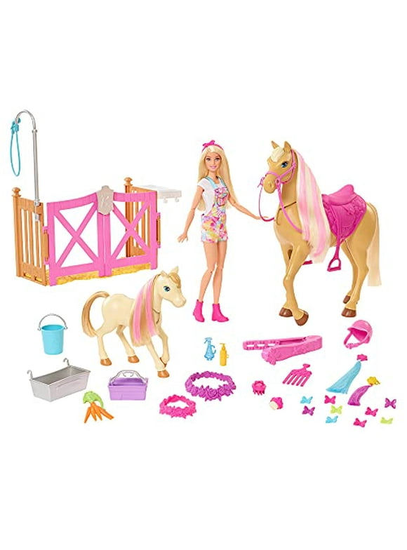 Amazon Com Barbie Groom N Care Horses Playset With Barbie Doll Blonde 11 5 In 2 Horses 20 Grooming And Hairstyling Accessories Gift For 3 To 7 Year Olds Amazon Exclusive Toys Games